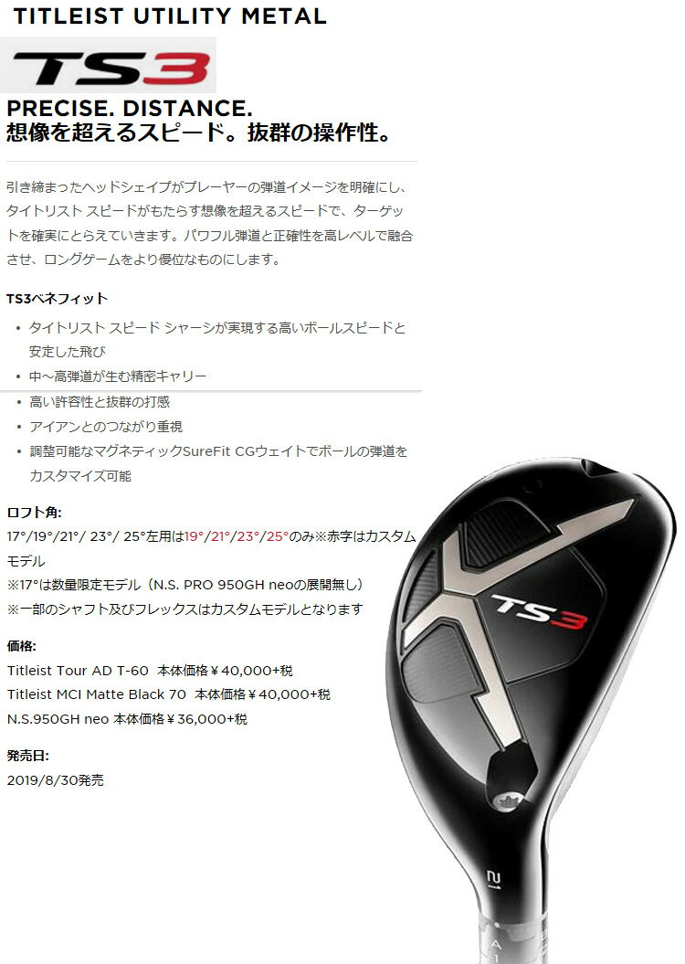 TS3ベネフィット ・タイトリスト スピード シャーシが実現する高いボールスピードと安定した飛び ・中〜高弾道が生む精密キャリー ・高い許容性と抜群の打感 ・アイアンとのつながり重視 ・調整可能なマグネティックSureFit CGウェイトでボールの弾道をカスタマイズ可能 ロフト角:17度/19度/21度/ 23度/ 25度 左用は19度/21度/23度/25度のみ *17°は数量限定モデル(N.S. PRO 950GH neoの展開無し) *一部のシャフト及びフレックスはカスタムモデルとなります 価格 Titleist Tour AD T-60 本体価格40,000+税 Titleist MCI Matte Black 70 本体価格40,000+税 N.S.950GH neo 本体価格 36,000+税 発売日:2019/8/30発売